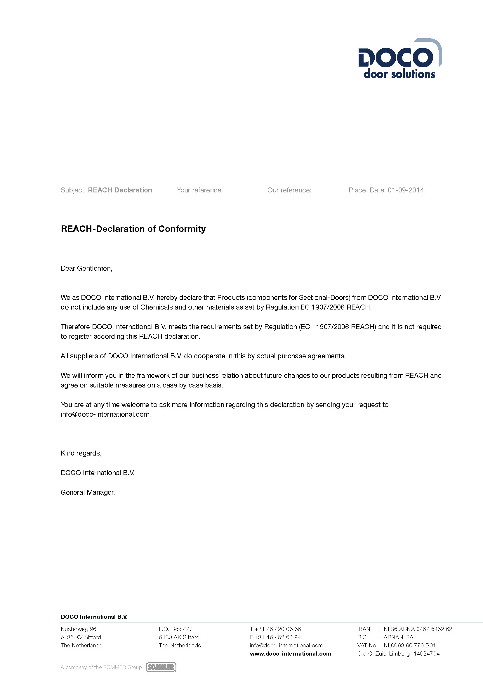 DOCO International hereby declares that in DOCO International B.V. products, no chemicals or other materials have been used as specified in regulation (EC) 1907/2006 REACH. Therefore, in accordance with this directive, DOCO International B.V. is not obliged to register this.