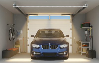 Many garages feature fixed windows above the door opening for natural daylight. In standard installations, the garage door power unit is positioned directly behind these windows and is visible from the outside.