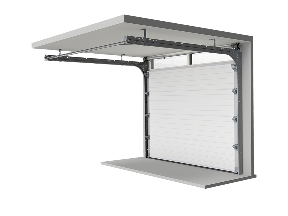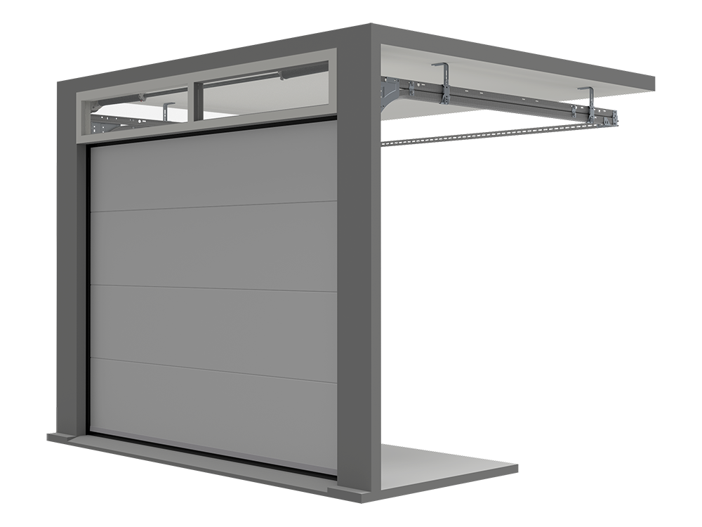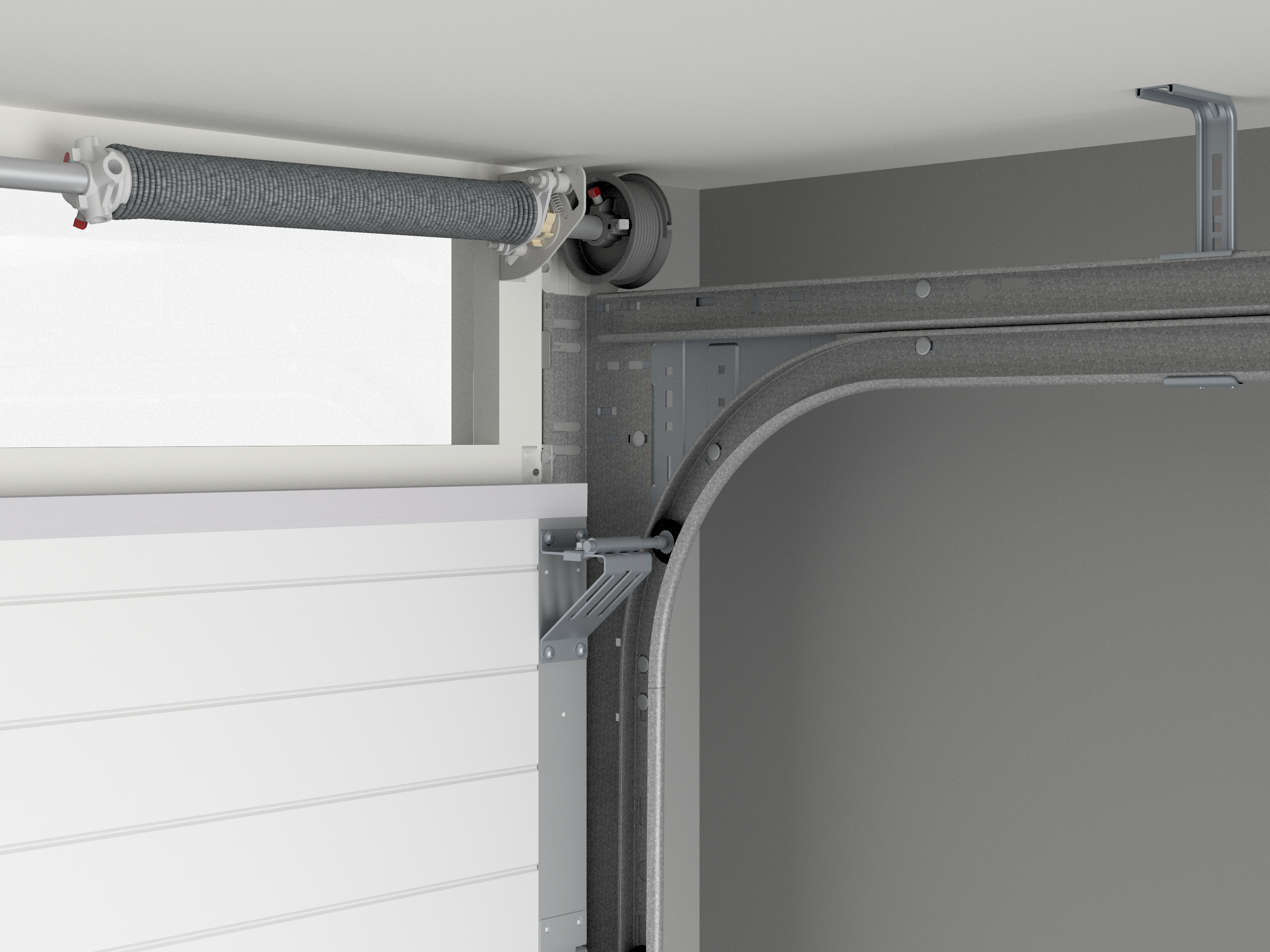 Our HOME-F residential door system offers a simple way to keep the power unit out of sight when windows are installed above the garage door opening.
