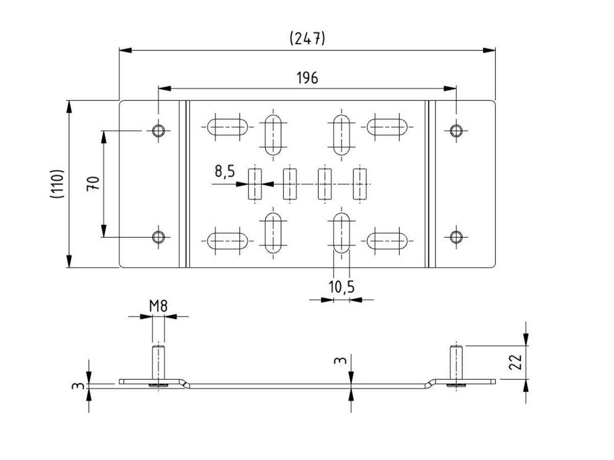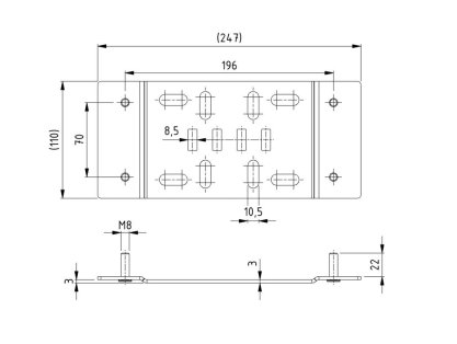 Flat mounting plate for spring break devices 25651, 29950 & 29951. Spring break device to be mounted with M8 nuts. To be used for residential doors with 4-spring solution.